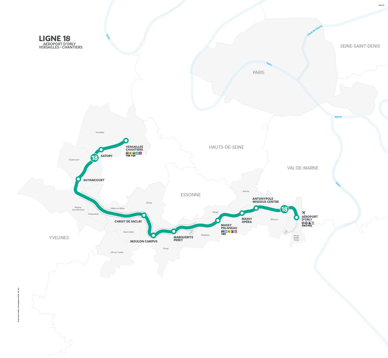 La Ligne 18, longue de 35 km, comprend 10 nouvelles gares et doit permettre de relier Orly à Versailles, via Massy et le plateau de Saclay. Le viaduc de 6,7 km a été totalement édifié fin 2023 pour une mise en service en 2026 et sera ponctué par trois nouvelles gares : Polytechnique à Palaiseau, Université Paris-Saclay à Orsay et Christ de Saclay. Le terminus prévu aujourd’hui pour la Ligne 18 est la gare Versailles – Chantiers, mais le prolongement de la ligne jusqu’à Nanterre, dans les Hauts-de-Seine, est de nouveau à l’étude.