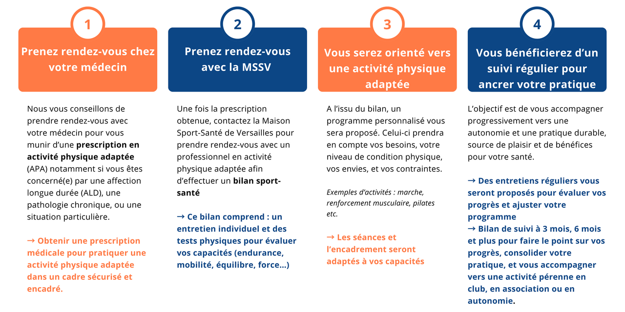 Implantée au cœur du quartier de Porchefontaine, la Maison Sport-Santé de Versailles (MSSV) vous accompagne à chaque étape pour renouer avec un mode de vie actif. Que vous soyez jeune ou senior, débutant ou en reprise d’activité, nos Enseignants en Activité Physique Adaptée (EAPA), passionnés et qualifiés, construisent avec vous un programme personnalisé pour intégrer durablement le mouvement dans votre quotidien.