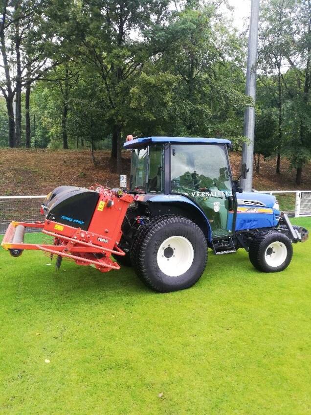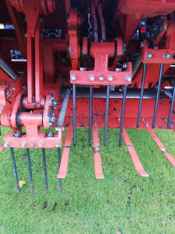 Le piquetage consiste à faire des trous fins et profonds dans le terrain à l'aide du vertidrain (photos ci-dessous). Cela permet de faire entrer l'eau plus facilement dans le sol, de remonter la terre, d'aérer en profondeur pour favoriser la souplesse et le rebond du terrain. Cette opération nécessite une journée de travail et est réalisée tous les 15 jours pour la Coupe du Monde de Rugby.