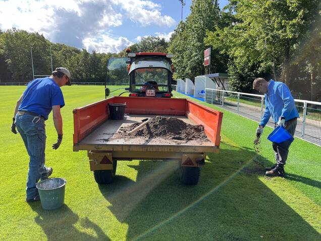 Deux fois par an, au mois d'avril et aux mois de septembre/octobre, les jardiniers réalisent un sablage en répartissant 20m3 de sable sur le terrain. Cette opération se déroule sur deux jours puisqu'il faut d'abord réaliser un piquetage du terrain et par la suite un balayage pour faire entrer le sable dans le gazon. Cela permet d'améliorer la souplesse et le drainage du terrain et de mieux faire tenir le gazon, qui pourra développer ses racines en profondeur.