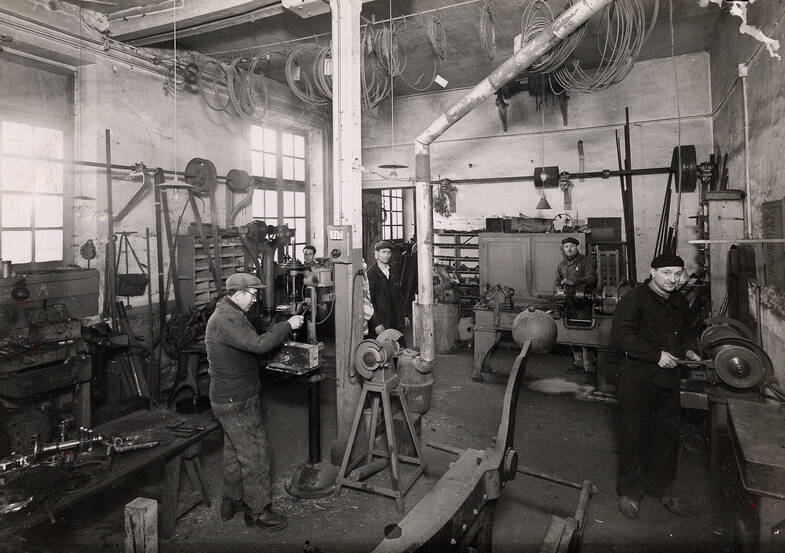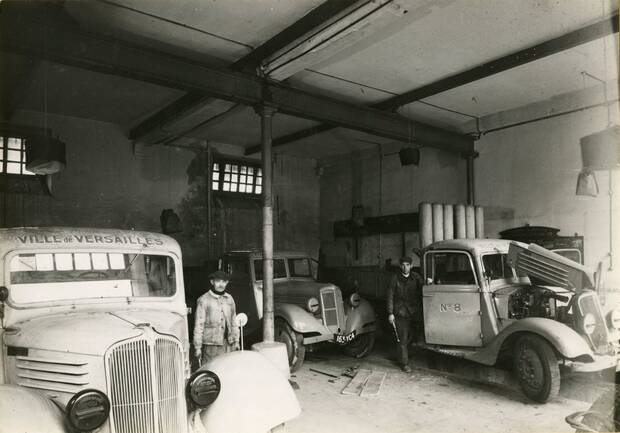 Sur l’état nominatif des personnels, ouvriers et assimilés, des Travaux communaux, établi en 1945, près de 200 agents travaillent pour cette direction installée au Menus-Plaisirs. Au sein de la 5e section en charge du Nettoiement-Eclairage-Ateliers-Cimetières, les Ateliers communaux fonctionnent sous la direction d’un chef d’équipe avec vingt-cinq agents et de nombreux corps de métiers représentés : mécanicien-ajusteur, forgeron, maréchal-ferrant, peintre tôlier-serrurier, charron, magasinier et afficheur, chauffeur, charretier, … et un garde de l’écurie des Menus-Plaisirs.