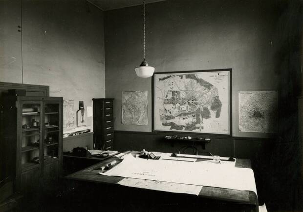 Les plans du site établis en 1954 permettent d'avoir une vision précise de la répartition des bureaux et magasins des Services techniques installés alors aux Menus-Plaisirs :