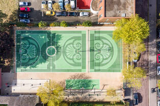 La Ville a souhaité mettre en place un design qui mêle le respect des contraintes liées à la pratique du basket (position des lignes, dimension des terrains, position des poteaux de basket) et l’esthétisme avec une référence aux jardins en privilégiant des nuances de verts. En effet, le revêtement est inspiré des lignes symétriques des jardins du château de Versailles créés par André Le Nôtre.