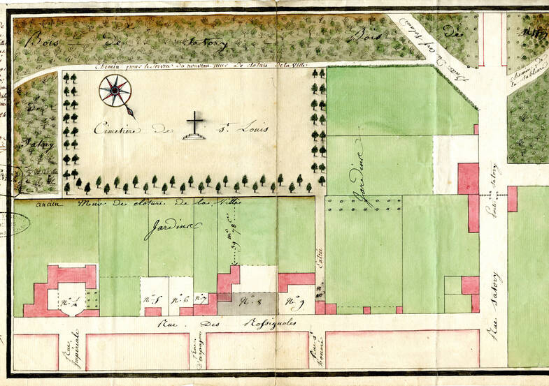 Un premier cimetière est créé en 1725, lors de la construction d'une chapelle, succursale de la paroisse-mère Notre-Dame, rendue nécessaire par le développement du quartier du Parc-aux-cerfs et bientôt érigée en paroisse indépendante sous le vocable de Saint-Louis.