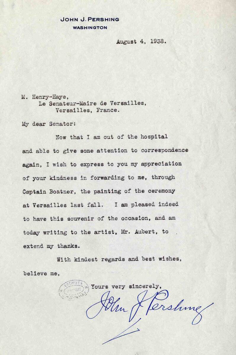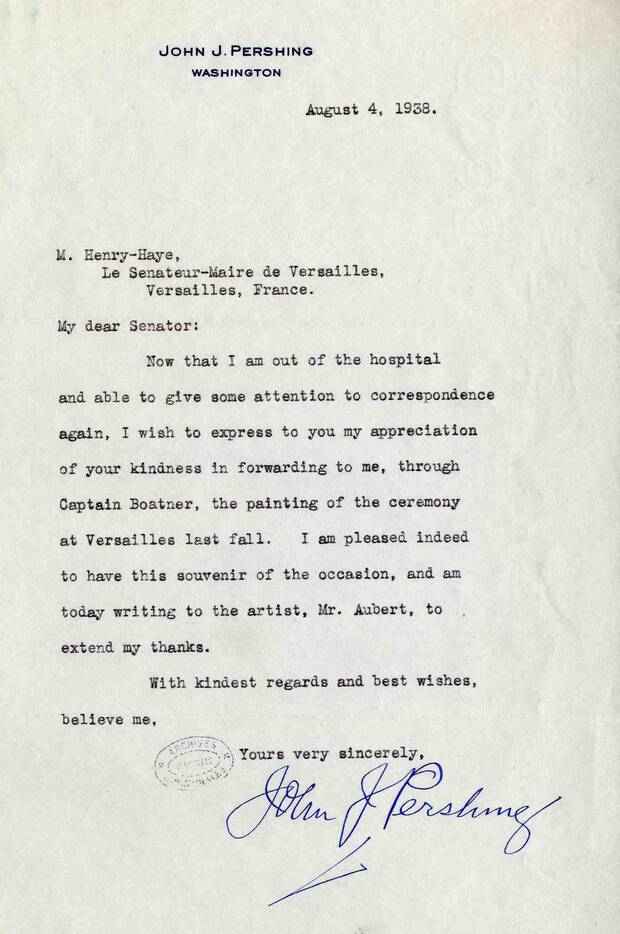Maintenant que je suis sorti de l’hôpital et capable de me pencher à nouveau sur ma correspondance, je souhaite vous exprimer toute ma reconnaissance envers votre gentillesse, qui a pensé à me transmettre, avec l’aide du Capitaine Boatner, la peinture de la cérémonie tenue à Versailles à l’automne dernier. Je suis particulièrement heureux d’avoir un souvenir de cet événement ; je compte d’ailleurs écrire aujourd’hui à M. Aubert, l’artiste, pour lui adresser mes remerciements.