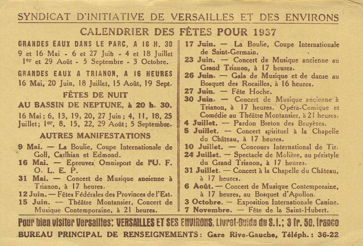 Le but premier du Syndicat d’initiative était de stimuler le tourisme local, tandis que les Fêtes versaillaises organisaient les fêtes locales, comme les Fêtes de nuit au bassin de Neptune à partir de 1862. Qui dit tourisme, dit aussi gestion du flux de visiteurs. Dans cette logique, le Syndicat d’initiative contribue à l’amélioration du réseau routier et des transports reliant Paris à Versailles.