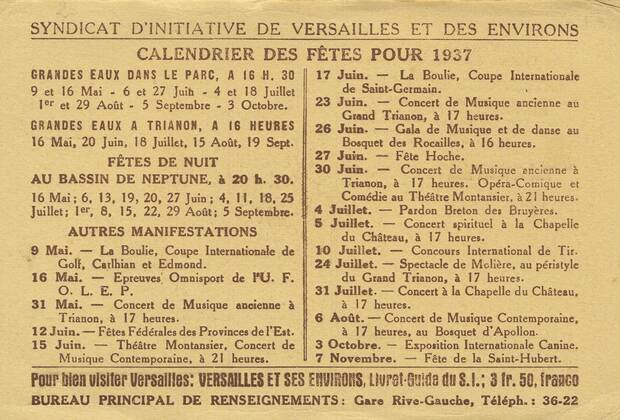 Le Syndicat d’initiative – Fêtes versaillaises n’a cessé d’élargir ses activités, assumant en continu les manifestations culturelles traditionnelles de la Ville : Son et lumière, les Fêtes de nuit et bien sûr, les Grandes eaux.
