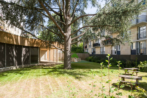 Depuis 2021, les enfants profitent d’un jardin enherbé dont les arbres ont été conservés. Un auvent leur permet d’être dehors tout en étant protégés des intempéries. Ce projet s’intègre dans la démarche Écolo crèche® engagée depuis 2019 par la Ville. Ce label constitue un gage de progrès en matière de développement durable.