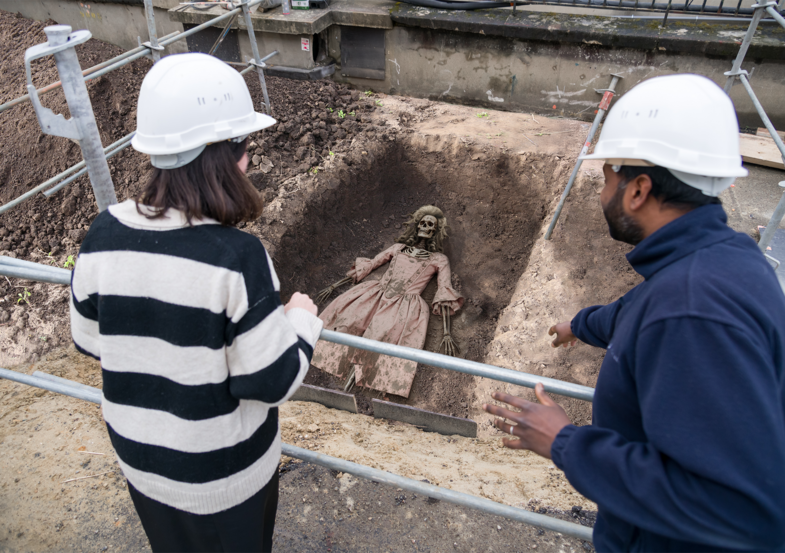 C’est lors du forage de la terrasse côté Est que les équipes du chantier ont fait une surprenante découverte : un squelette étonnamment bien conservé ! Des archéologues experts en analyse et datation d’ossements ont été mandatés pour prélever des échantillons. Les résultats de l’analyse ont été révélés aujourd’hui : le squelette date du XVIIe siècle.