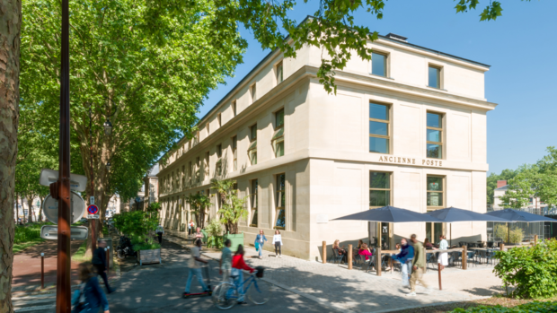 Cette nouvelle médiathèque s'installe à l'Ancienne Poste, le nouvel espace culturel et événementiel ouvert à toutes les générations, au cœur de Versailles, qui a été rénové par la Ville de Versailles et l’agence Marchi Architectes. Conçu, réalisé et géré par la Ville de Versailles, ce lieu multimodal est dédié à une diversité d’activités telles que des expositions et des événements variés. Il accueille également un espace de restauration, le "food court" Sept Lieux.