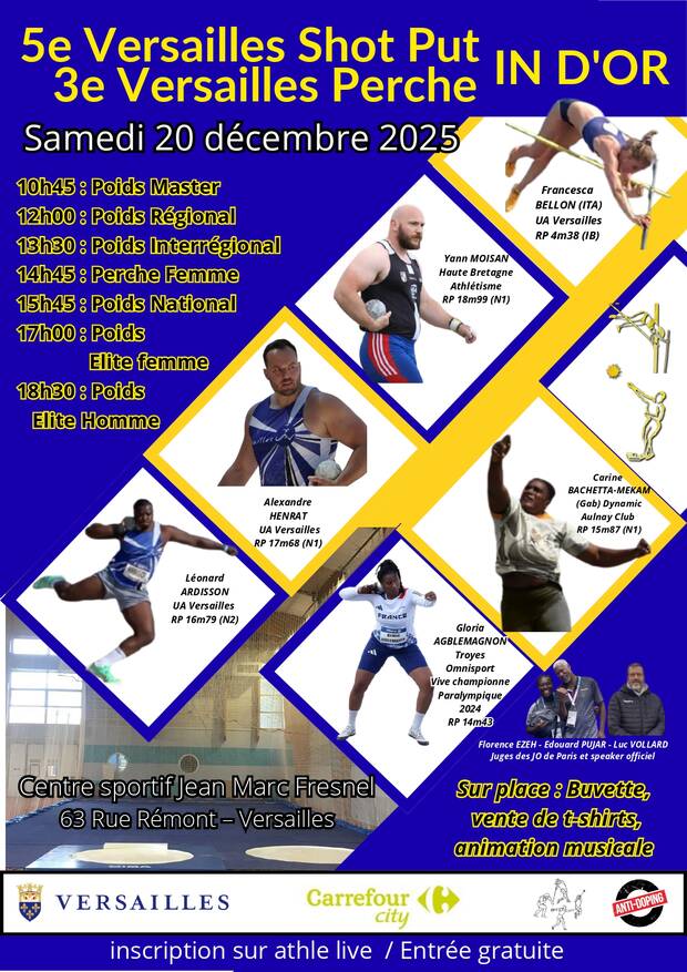 L'Union Athlétique de Versailles (UAV) organise une compétition d'athlétisme en salle avec au programme des concours de lancer de poids et de saut à la perche :