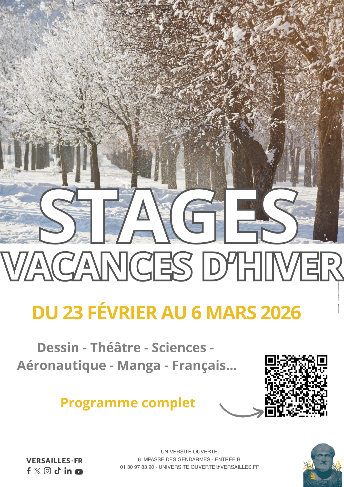 Pendant les vacances d’hiver, l’Université Ouverte de Versailles propose une programmation de stages spécialement conçus pour le jeune public et les adultes. Créatifs, culturels ou ludiques, ces stages sont l’occasion idéale de découvrir, expérimenter et développer de nouvelles compétences dans une ambiance conviviale et stimulante.