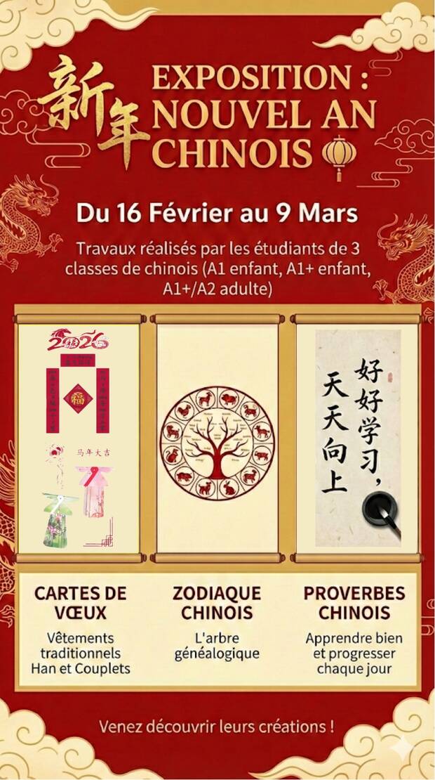 Pour célébrer le nouvel an chinois et l'année du Cheval de Feu, l’UOV a le plaisir de présenter, du 16 février au 9 mars, une exposition réalisée par les élèves des classes de chinois (cours de niveaux A1 enfant, A1+ enfant et A1+/A2 adulte).
