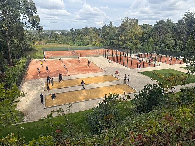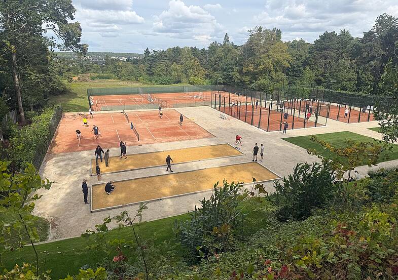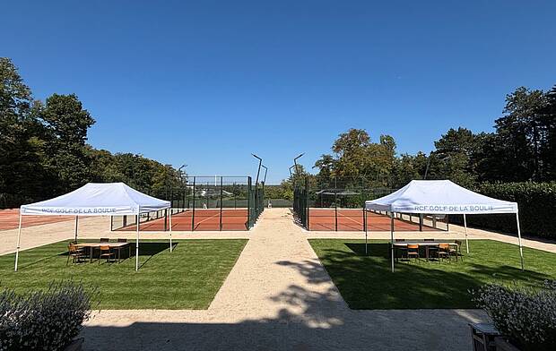 - 2 terrains de padel en terre battue, uniques en Île-de-France, pour une expérience de jeu confortable et innovante
