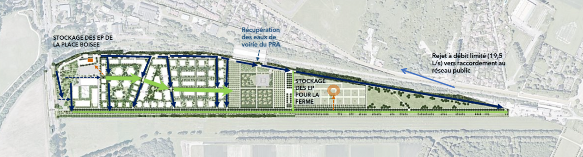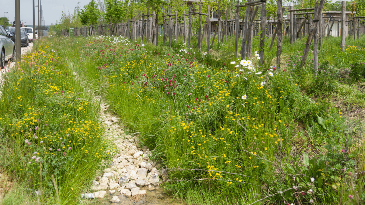 - L’eau non infiltrée s’écoule dans un réseau de noues ou fossés végétalisés.