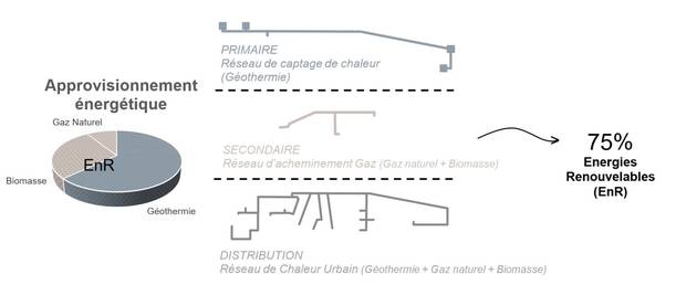 Au total, 75 % de l’énergie du quartier est renouvelable, ce qui limite les émissions de CO₂ et rend les logements plus sobres en énergie.
