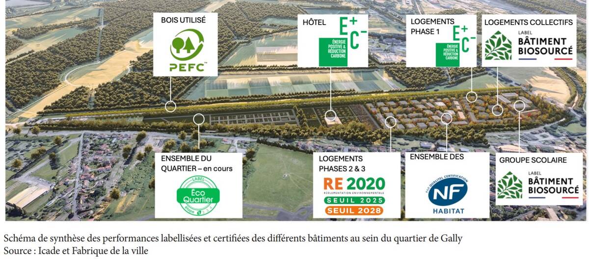 - Les bâtiments respectent des labels exigeants (Labellisation « NF Habitat » pour l’ensemble des logements, Label E+ C- RE2020 pour la conception des premiers bâtiments puis RE2025 et RE2028 pour les dernières phases du projet).