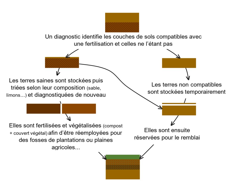- La terre déjà présente sur le site est traitée et réutilisée directement sur place afin de favoriser le recyclage des matériaux dans une logique d’économie circulaire.