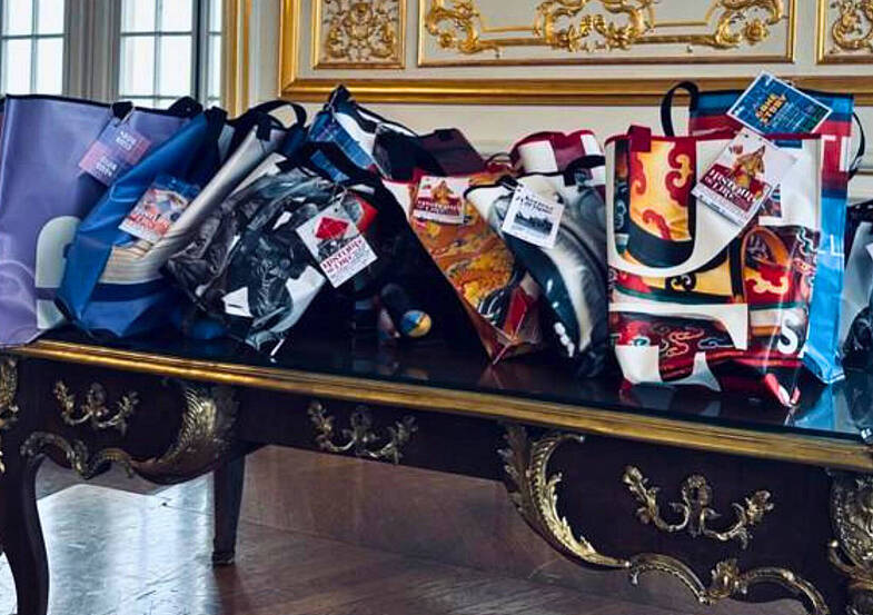 Ont été utilisées pour concevoir ces sacs cabas des bâches de Game Story, des JOP 2024, du Mois Molière, d'Histoire de Lire, etc.