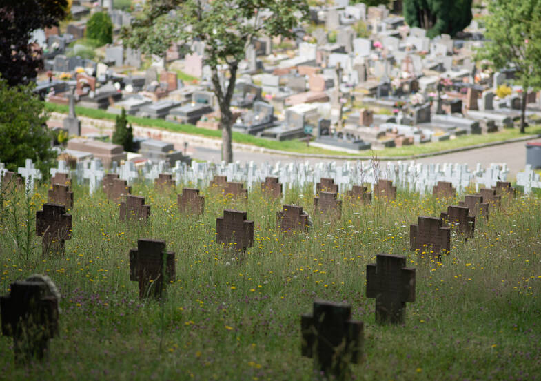 - Entretien des espaces verts en gestion écologique des 4 cimetières (tonte des gazons, désherbage des massifs fleuris et arbustifs, paillage arrosage très ponctuel ...)