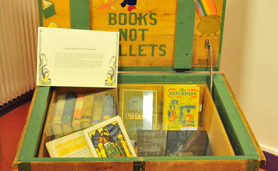 La bibliothèque conserve encore aujourd’hui une malle, remplie de 139 livres américains pour la jeunesse et d'une vingtaine de lettres d'écoliers de Bridgeport (Connecticut). Elle a été envoyée fin 1946 à la bibliothèque de l'Heure Joyeuse de Versailles, à la suite d'un mouvement de solidarité né outre-Atlantique après la seconde Guerre Mondiale. La malle est arrivée à destination dans le courant de l'année 1948, par l'intermédiaire de l'organisme Our world united through books Inc. qui, par ses actions, connut un certain rayonnement en Europe. Les inscriptions qui y figurent témoignent de la volonté d'une paix durable, d'échanges interculturels et de connaissance mutuelle des peuples : "UNITED THROUGH BOOKS" et "BOOKS NOT BULLETS".