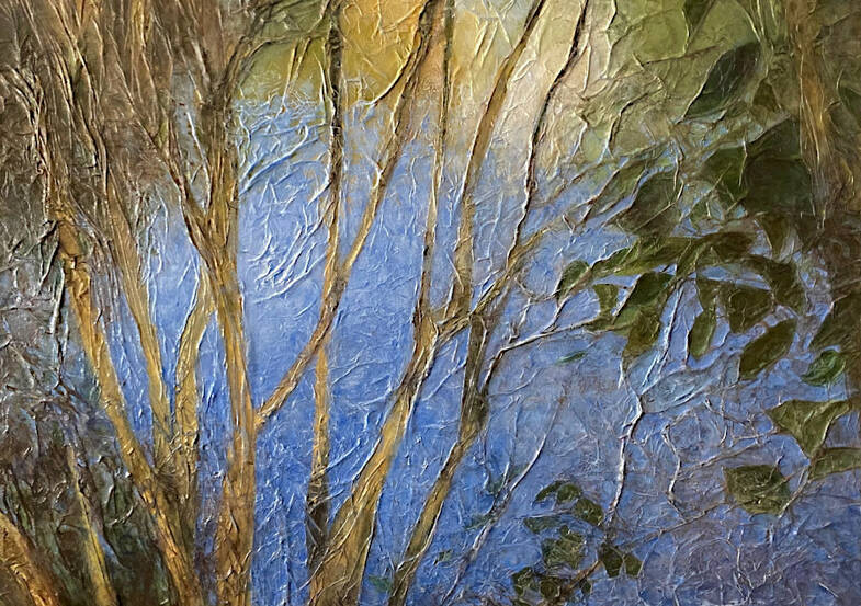 Étangs secrets est une invitation à pénétrer dans l’émerveillement de l’artiste peintre Lucie Gay pour la lumière qui l’entoure. Elle présente des œuvres – huile sur toile et technique mixte – regards sur le rapport entre la nature et l’eau, qu’elle décline en différentes visions à la limite entre figuration et abstraction. Pour certaines œuvres, des papiers sont froissés, plissés, collés et peints. Cette gestuelle en étapes successives est une constante dans l’œuvre de Lucie. Ses tableaux sont liés par des gammes de couleurs dans un esprit de séquence. L’artiste aime plonger le visiteur dans son univers, nous sommes ainsi parmi les feuilles et leurs nervures, l’eau, le ciel, le bois, la couleur, la lumière, la transparence des éléments. Le temps est suspendu dans cette nature à la fois sauvage et domptée, secrète.