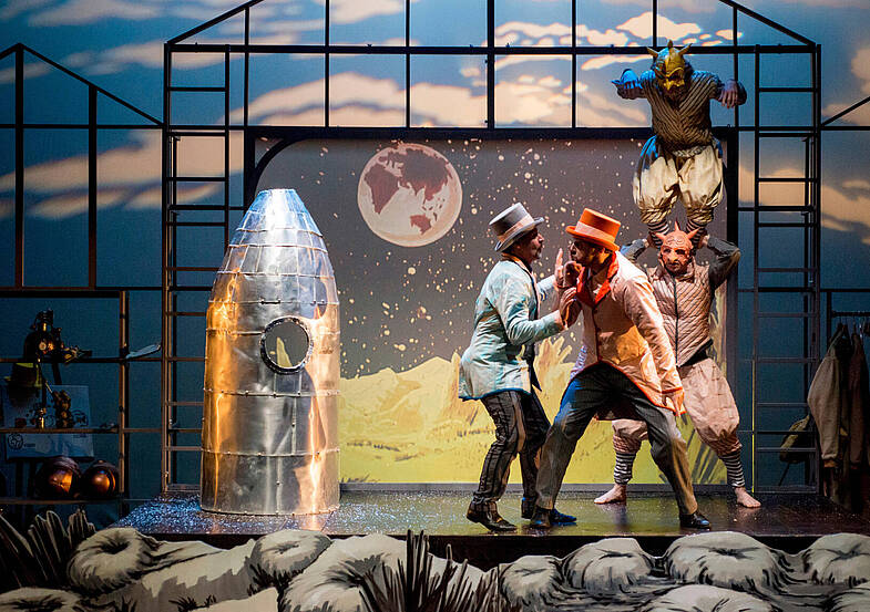 Voyage sur la lune inspiré de De la Terre à la Lune, voyage sous la terre inspiré de Voyage au centre de la Terre, voyage sous la mer inspiré de Vingt mille lieues sous les mers et voyage dans le temps pour se retrouver sur un plateau de tournage d’un studio de cinéma du début du XXe siècle. Inventions, trucages, magie, illusions, ombres et marionnettes servent le jeu des comédiens qui adoptent les codes de jeu expressionniste du cinéma pour interpréter ces histoires sur des airs de Satie, Debussy, Stravinsky, Saint-Saëns et Tchaïkovski.